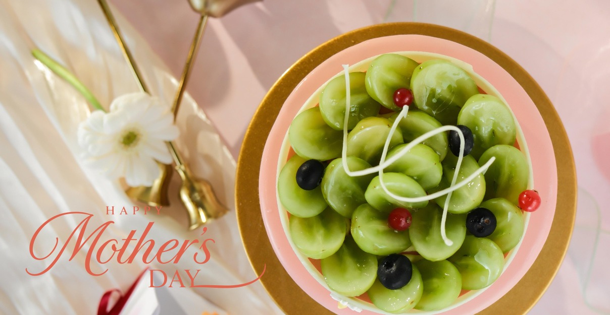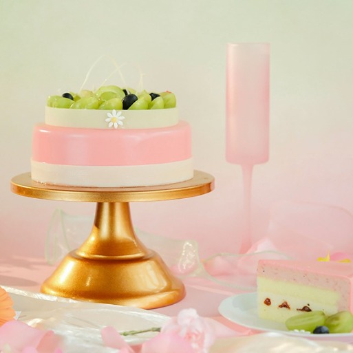 外觀以柔和玫瑰色為基調,頂部鋪以新鮮青葡萄與藍莓點綴,呈現如花園般自然展開的視覺意象。花香與果香在口中緩緩延展,留下輕盈且恰到其分的甜味收束,為母親節餐桌增添一份細緻而優雅的甜點表現。
